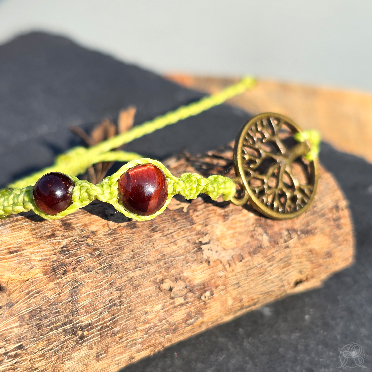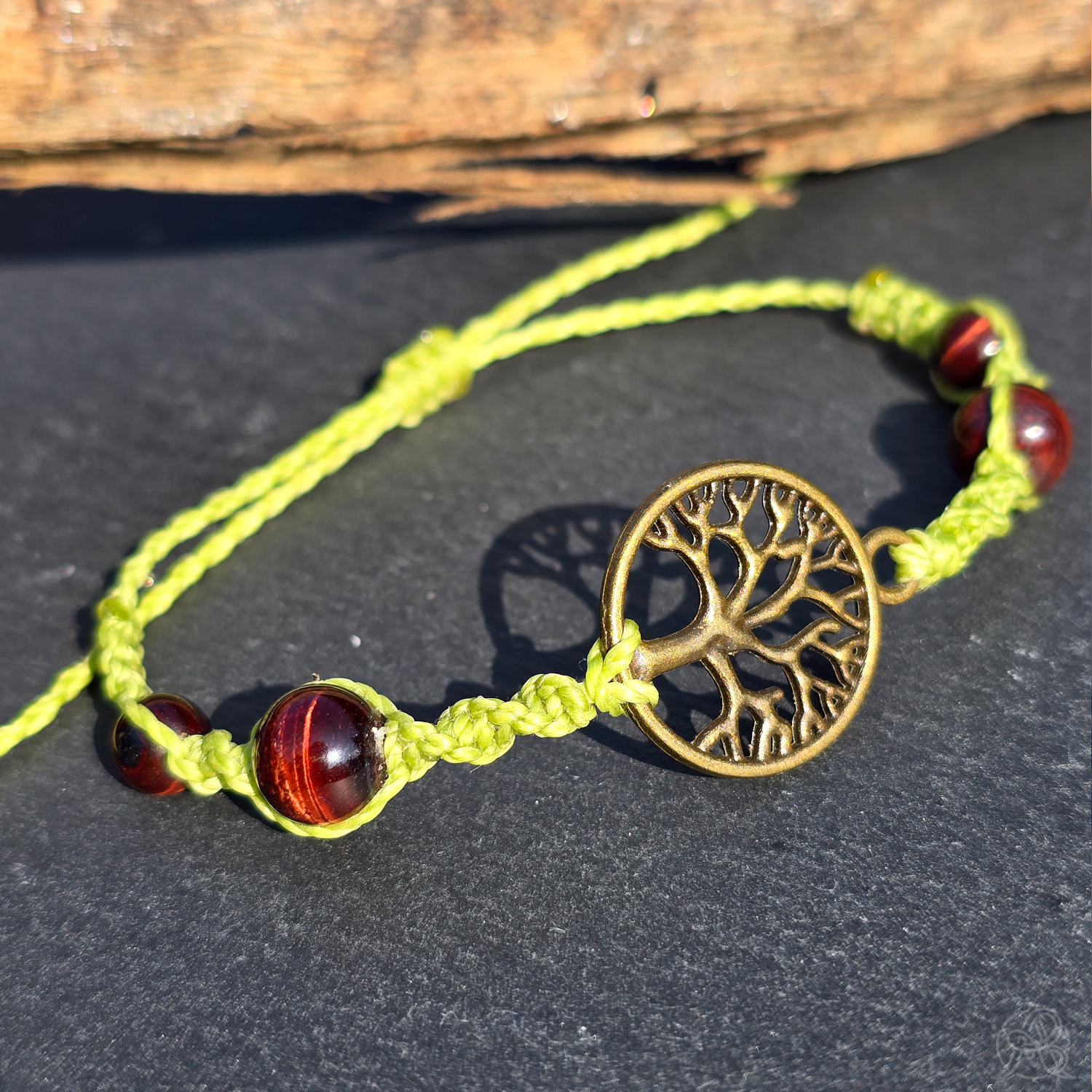 Ce bracelet avec un arbre de vie et perles en œil de taureau est fait main en micro-macramé et s’ajuste à tous les poignets grâce à un nœud coulissant.