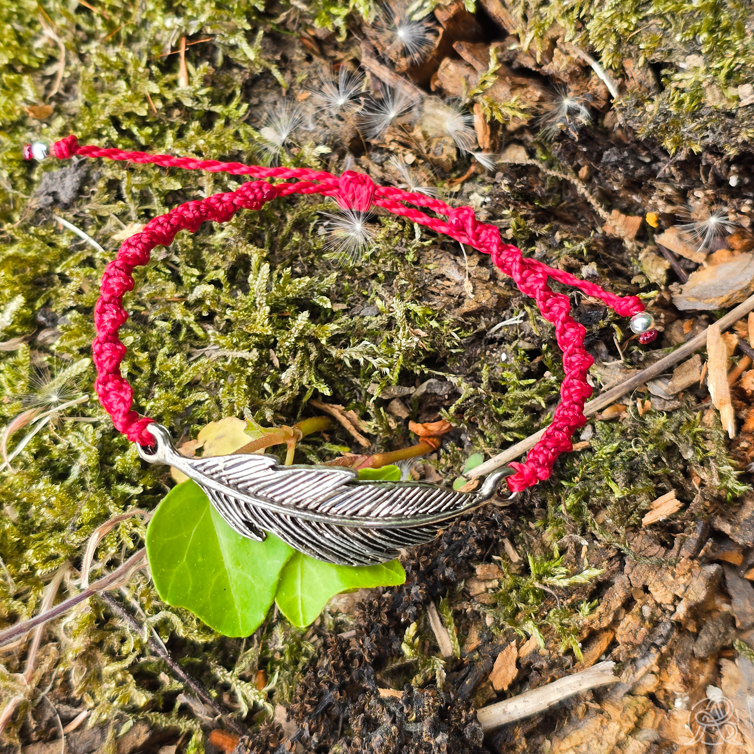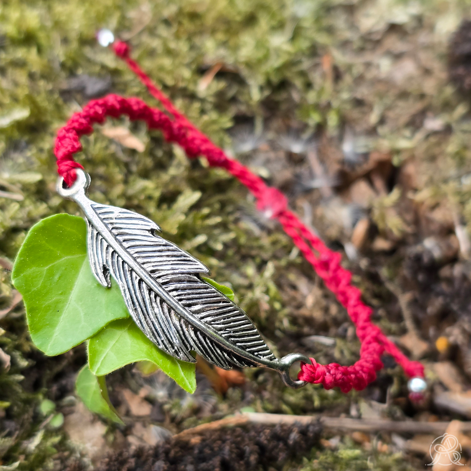 Ce bracelet avec une plume en laiton argenté est fait main en micro-macramé et s’ajuste à tous les poignets (féminins comme masculins) grâce à un nœud coulissant.