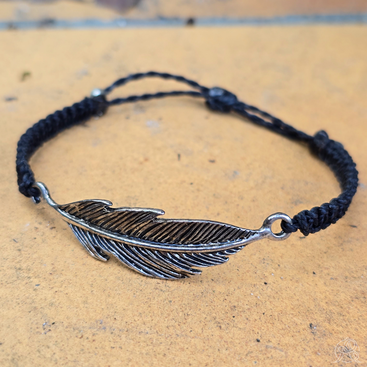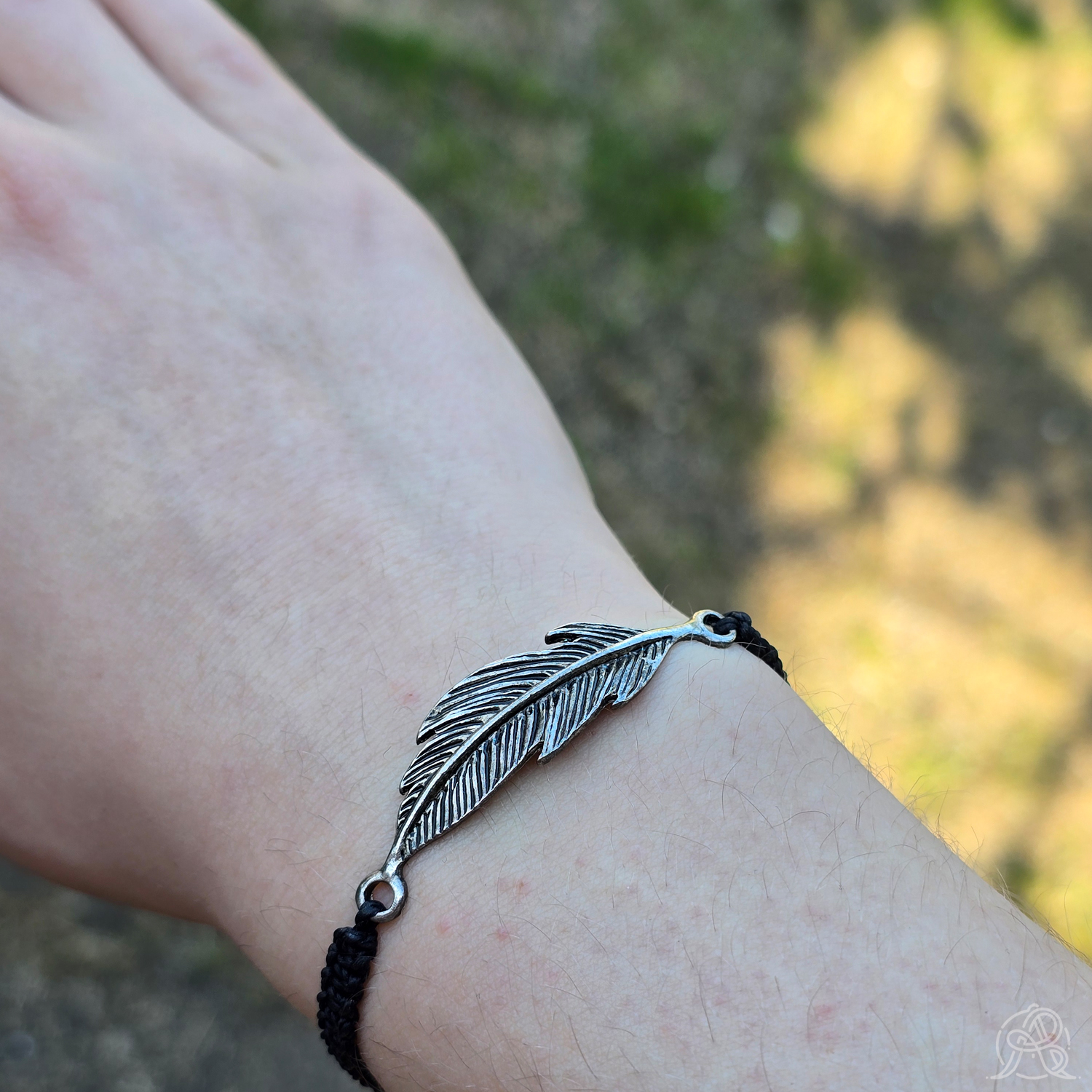 Ce bracelet avec une plume en laiton argenté est fait main en micro-macramé et s’ajuste à tous les poignets (féminins comme masculins) grâce à un nœud coulissant.