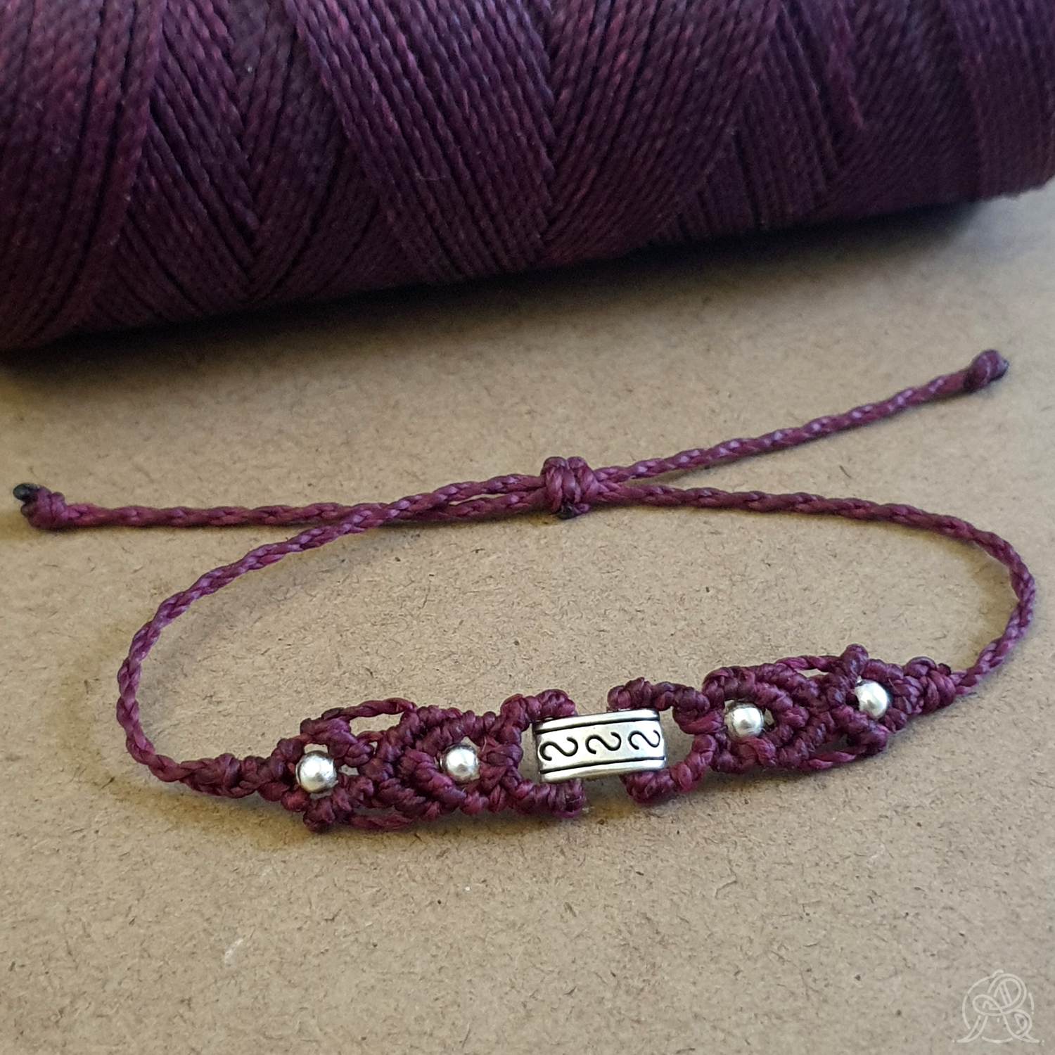 Ce bracelet avec une perles en laiton argenté est fait main en micro-macramé et s’ajuste à tous les poignets grâce à un nœud coulissant.