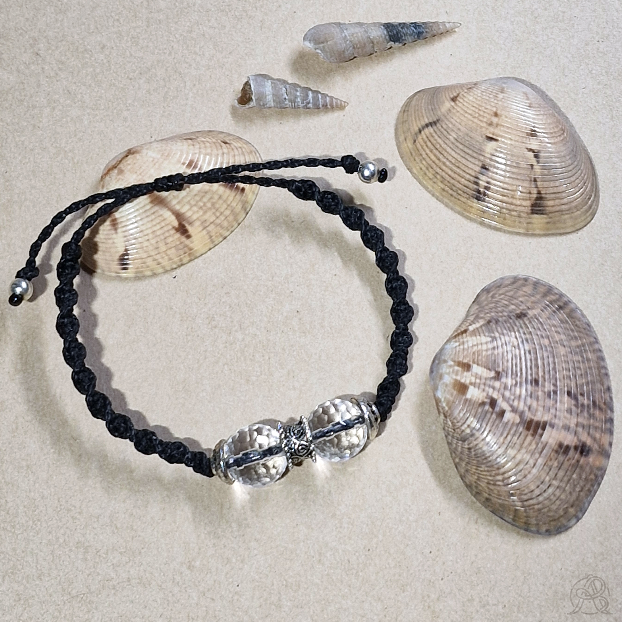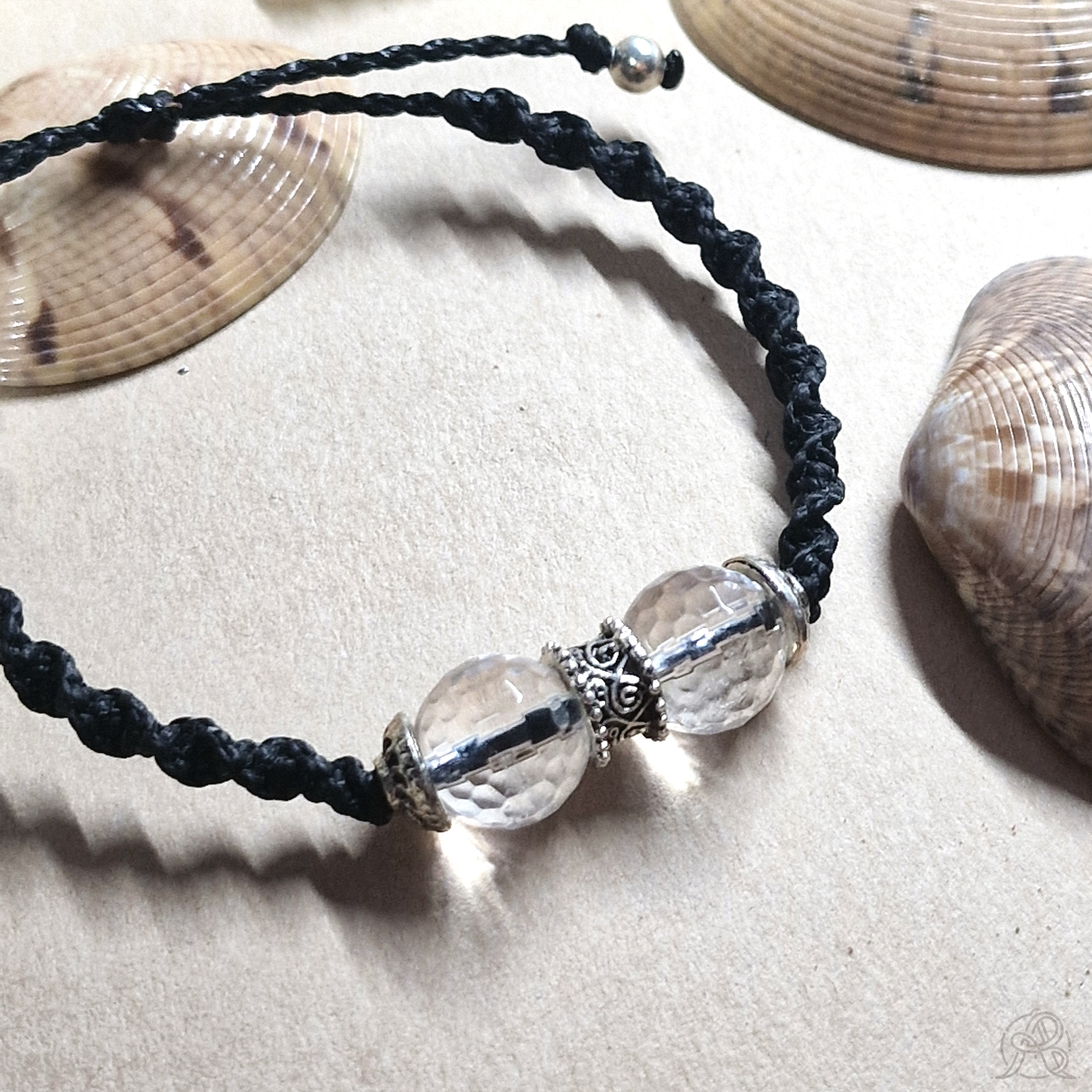 Ce bracelet avec des perles à facettes de quartz blanc est fait main en micro-macramé et s’ajuste à tous les poignets grâce à un nœud coulissant. Perles argentées.