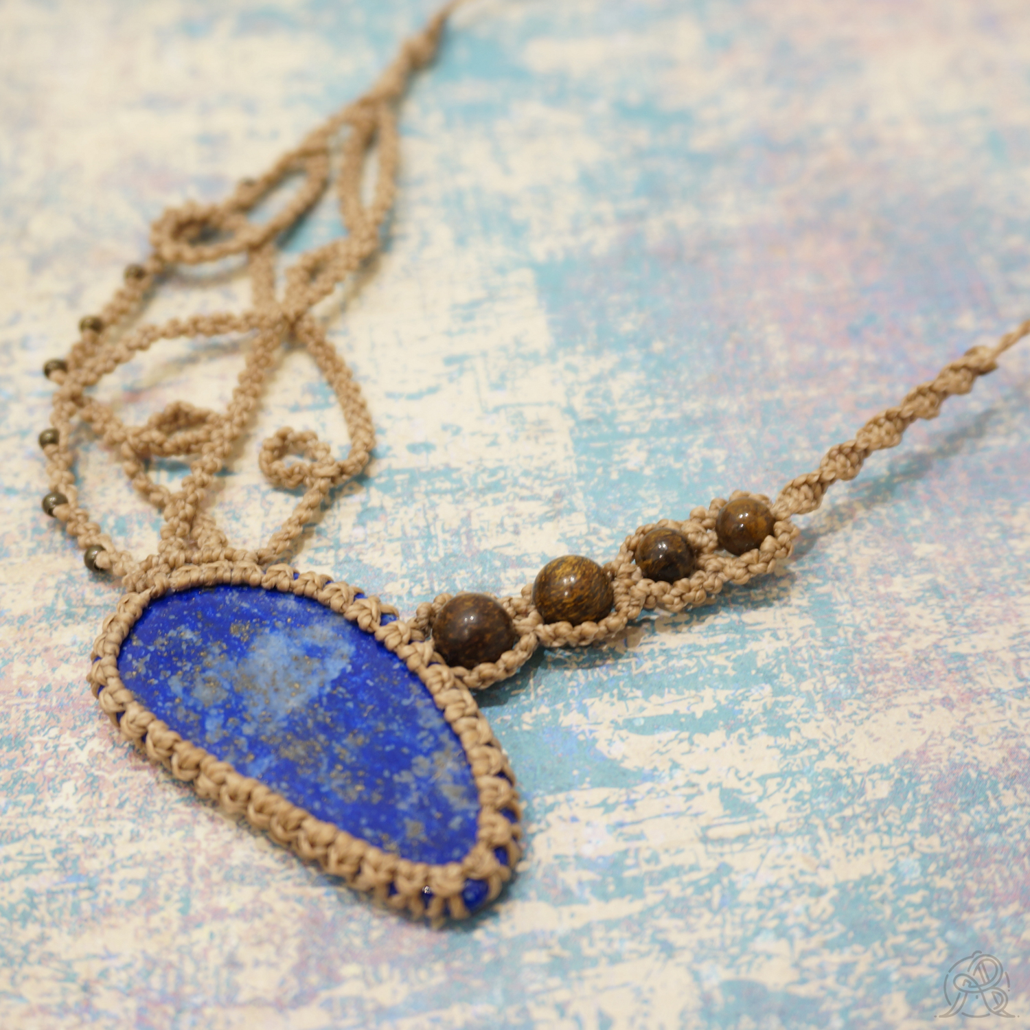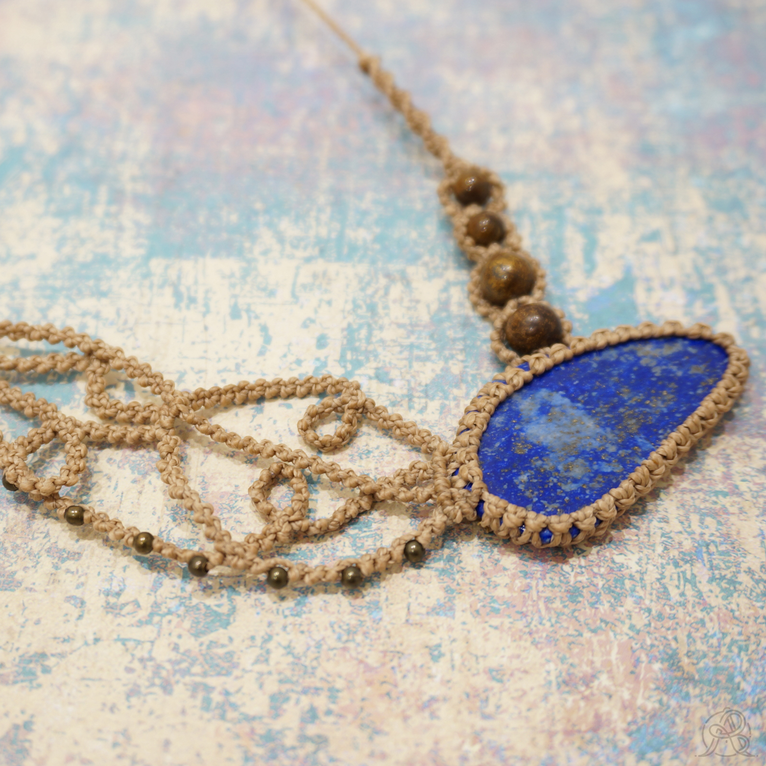 Cabochon en pierre de lapis lazuli sertie par la technique de micro-macramé avec un fil de couleur beige. La pierre naturelle est montée en collier de manière asymétrique avec des perles de bronzite et un délicat travail de micro-macramé . Le cordon est de longueur réglable grâce à un nœud coulissant.