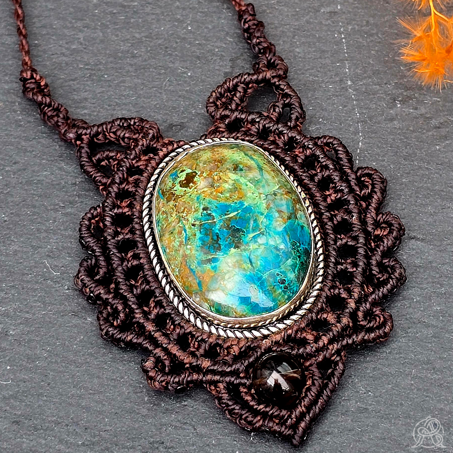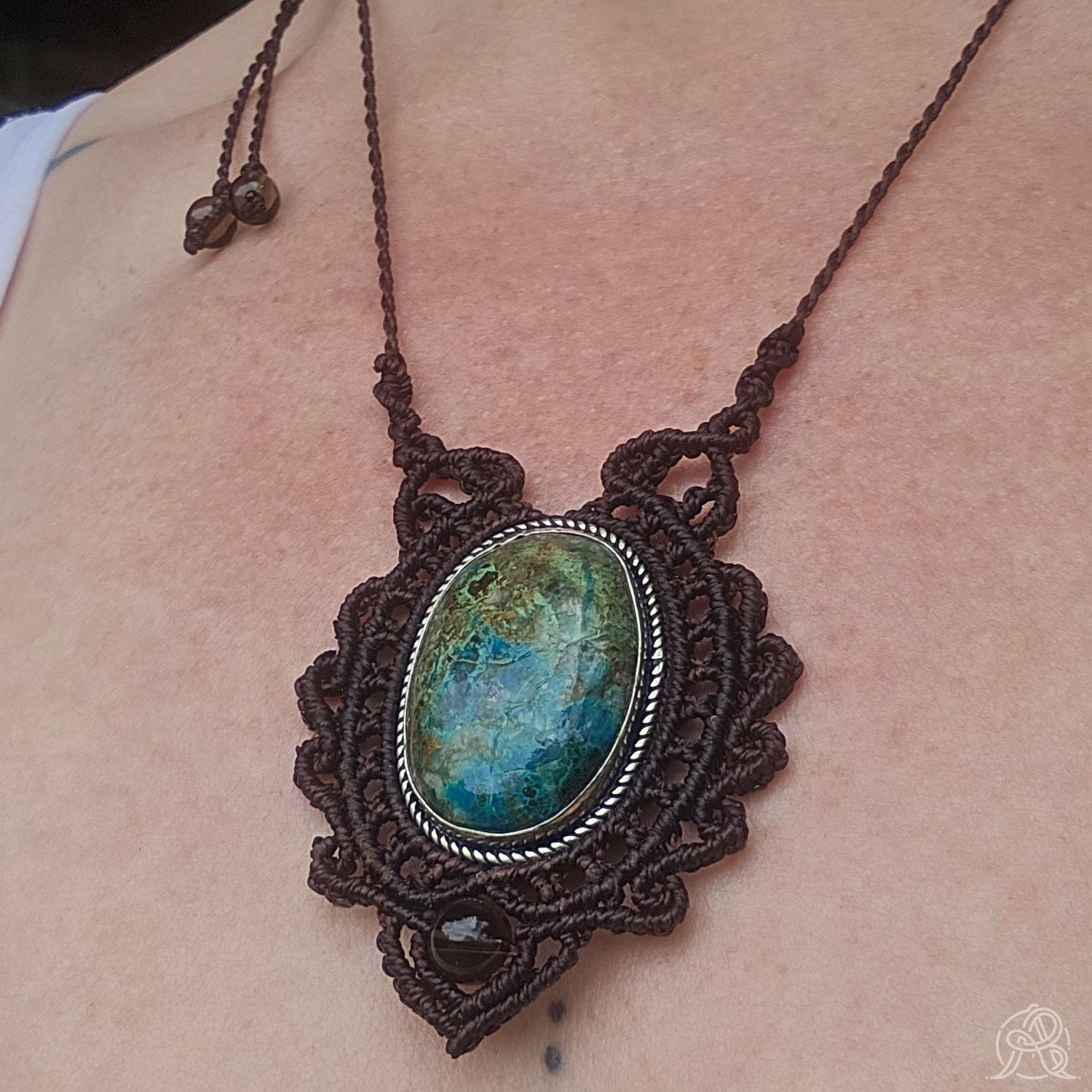 Pierre de chrysocolle sertie en laiton puis par la technique de micro-macramé avec un fil de couleur brun ébène. Des perles en quartz fumé accompagnent la pierre naturelle. Le cordon est de longueur réglable grâce à un nœud coulissant.