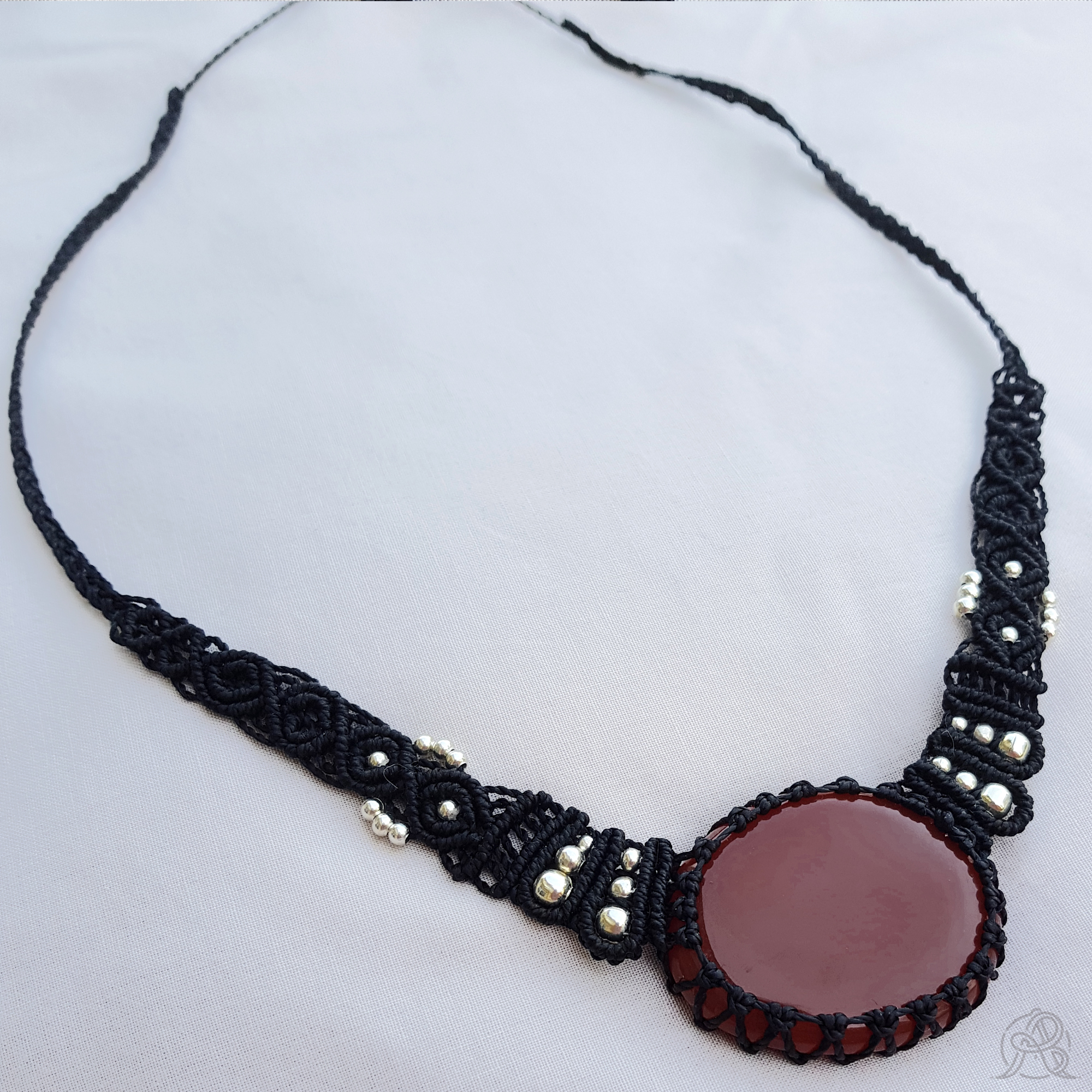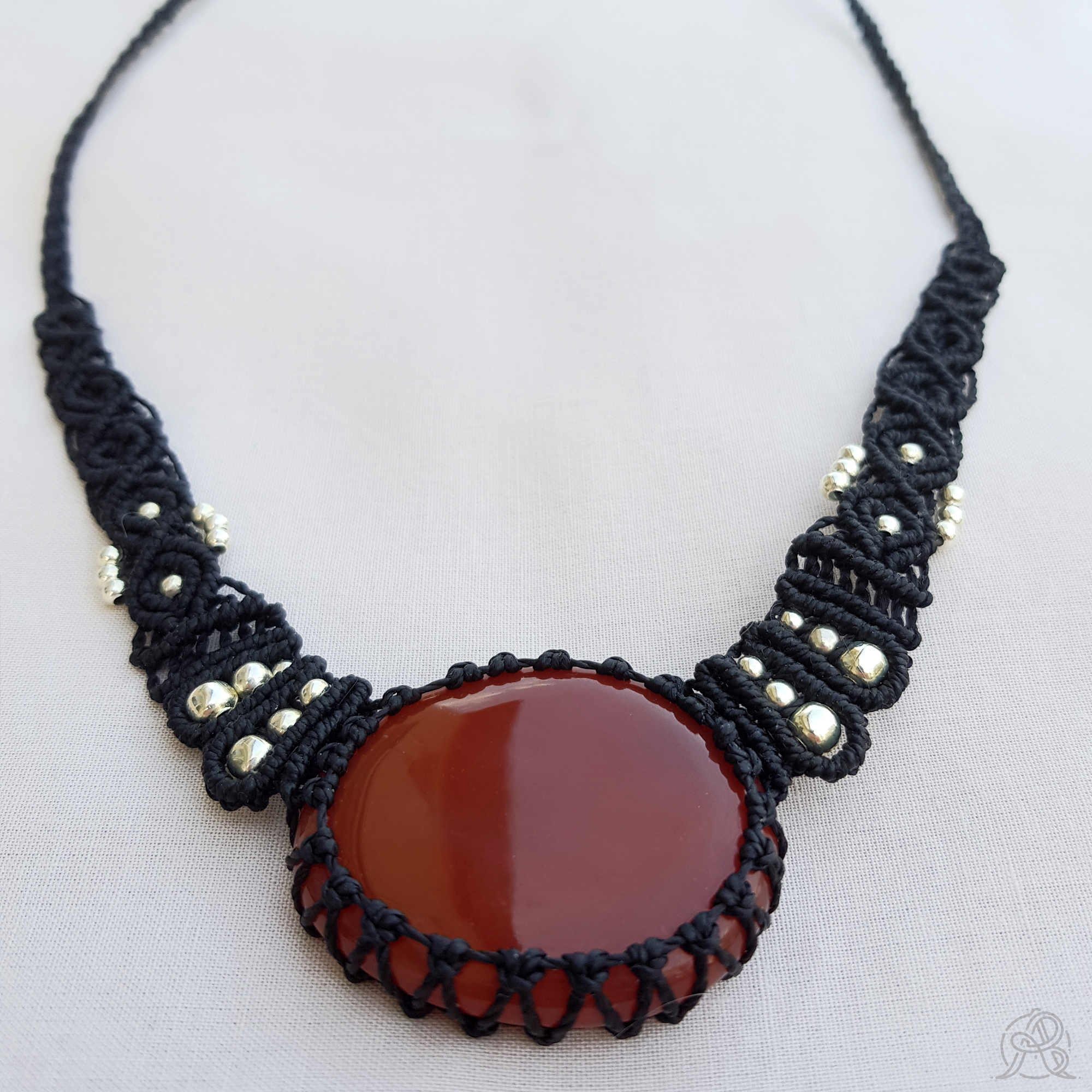 Pierre de cornaline sertie par la technique de micro-macramé avec un fil de couleur noir. La pierre naturelle est montée en collier avec un délicat travail de nouage et des perles métalliques argentées. Le cordon est de longueur réglable grâce à un nœud coulissant.