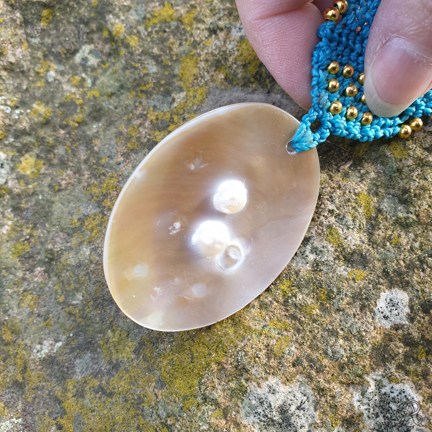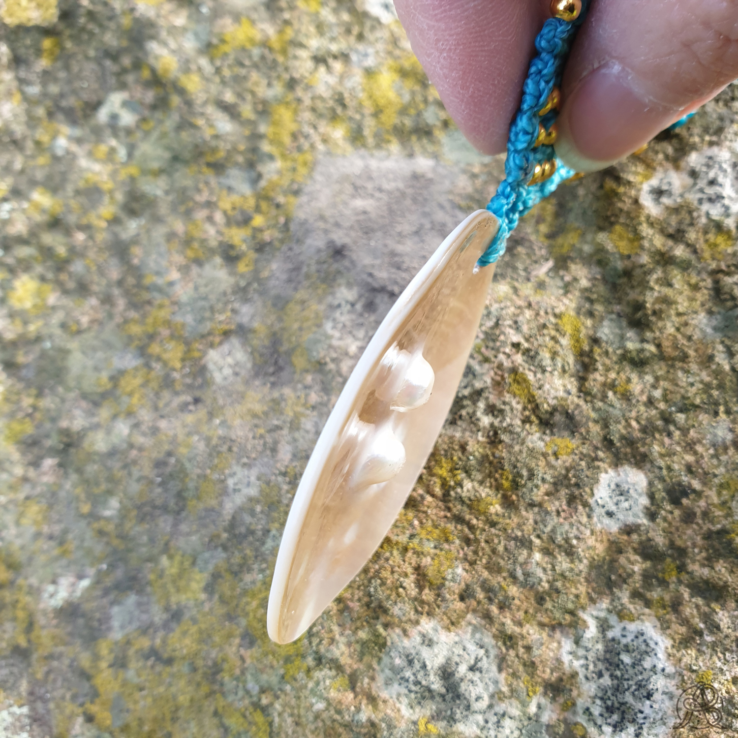 Coquille d’huître perlière montée en collier avec la technique de micro-macramé avec un fil de couleur turquoise. Au dos de la coquille se trouvent 2 perles naturelles encore emprisonnées dans la nacre.