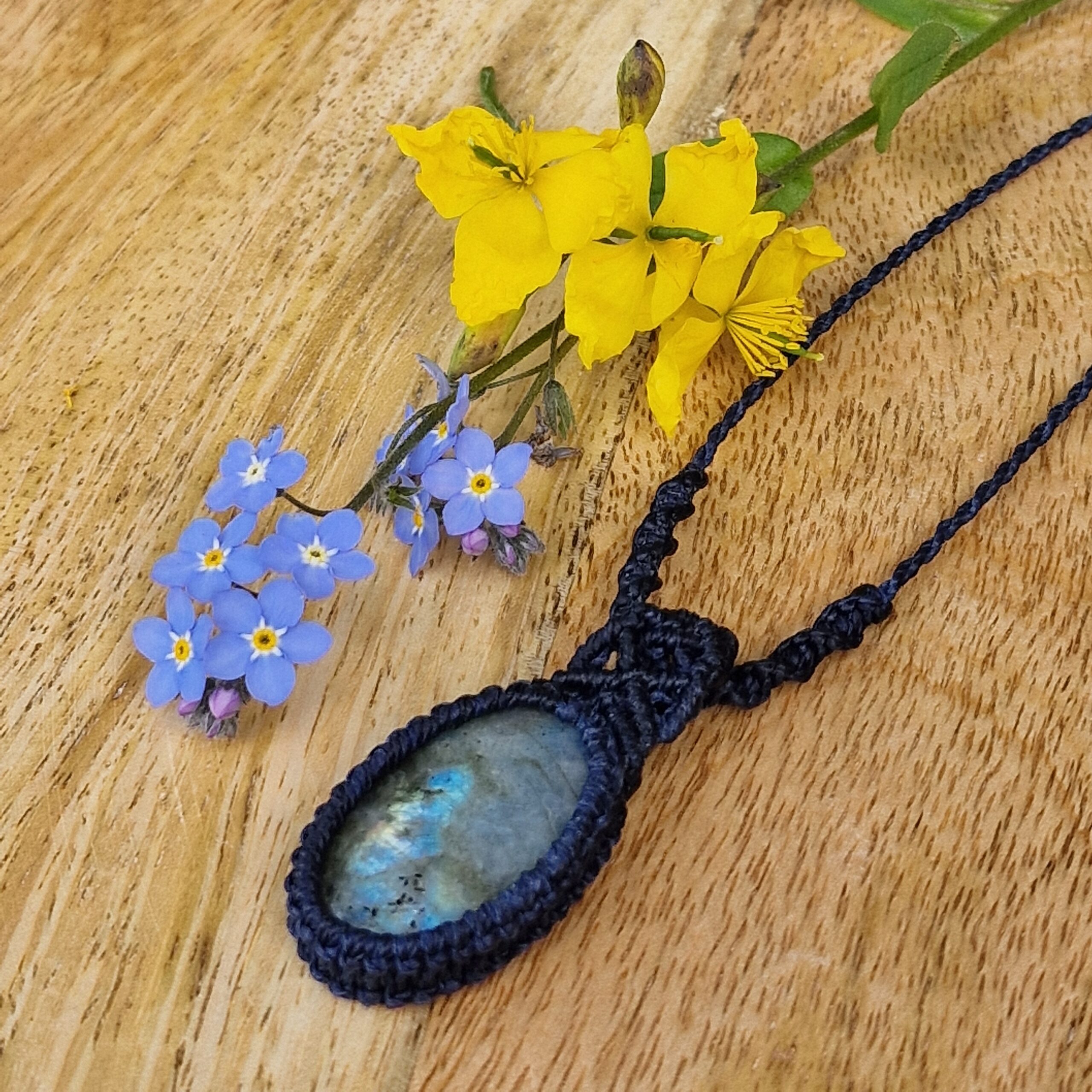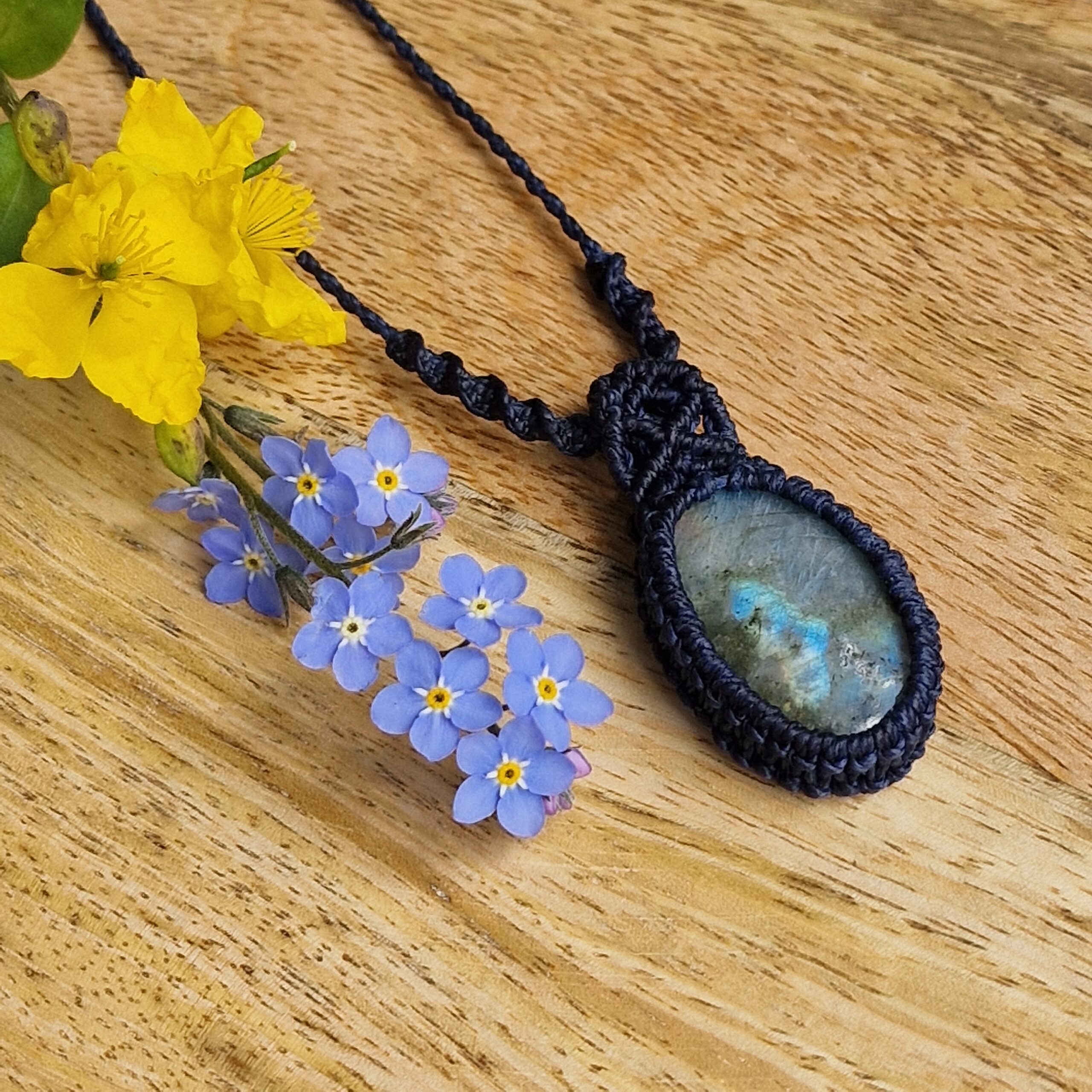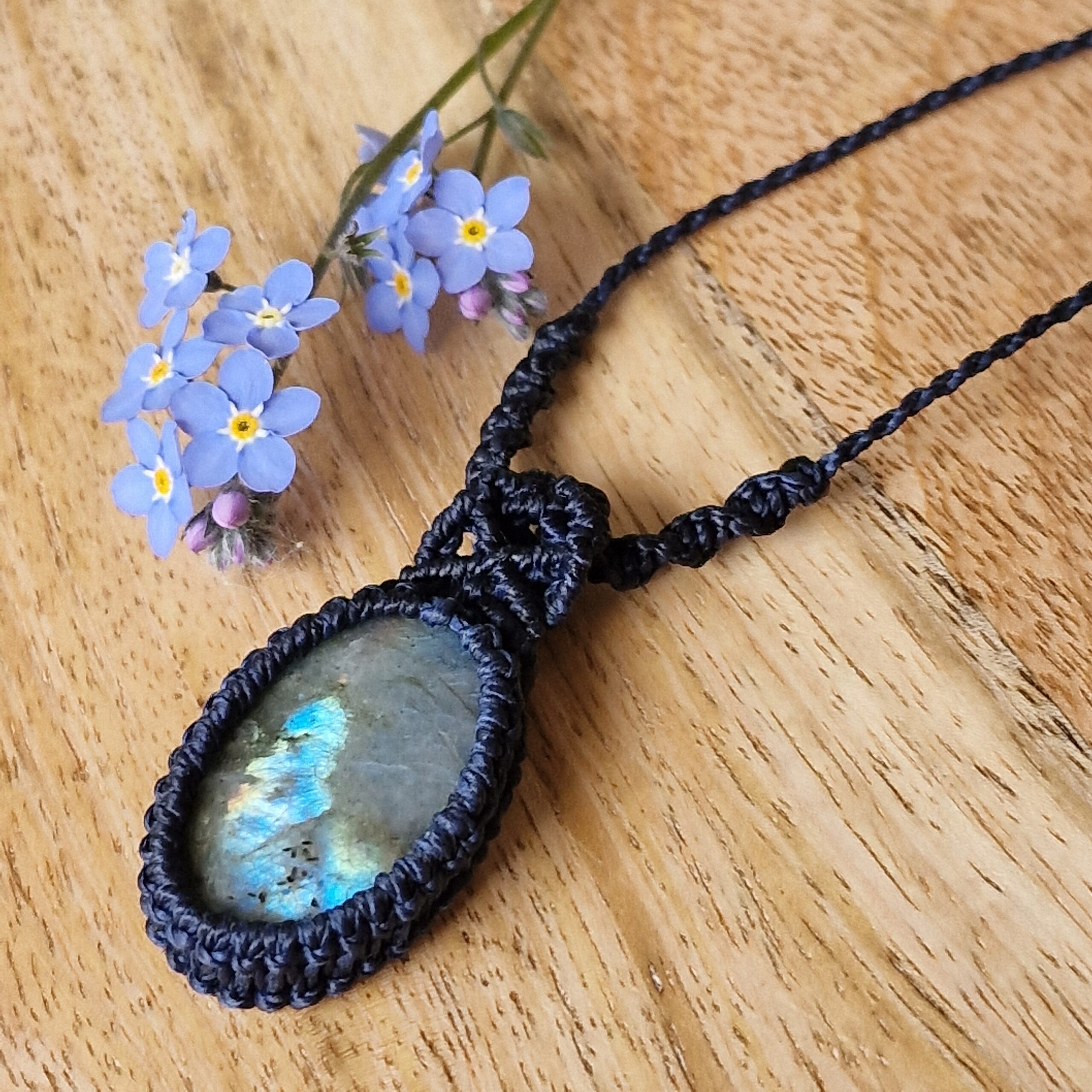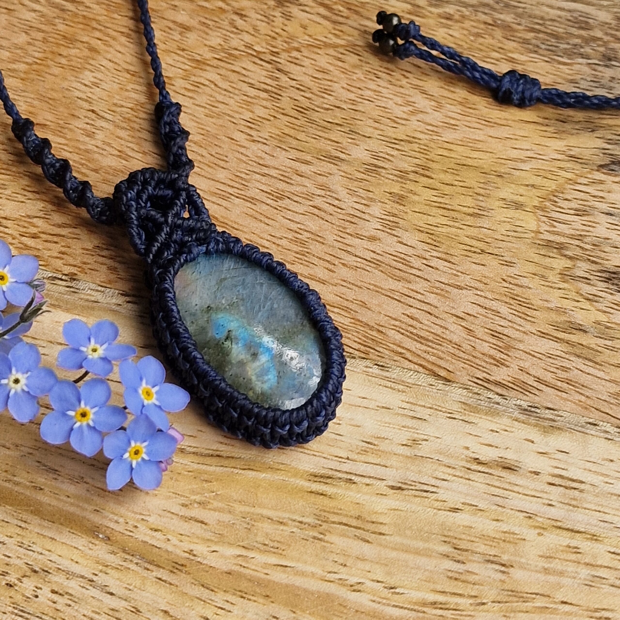 Pierre de Labradorite de forme ovale sertie par la technique de micro-macramé avec un fil de couleur marine. La pierre naturelle est montée avec une bélière en micro-macramé et est placée sur un cordon de longueur réglable grâce à un nœud coulissant.