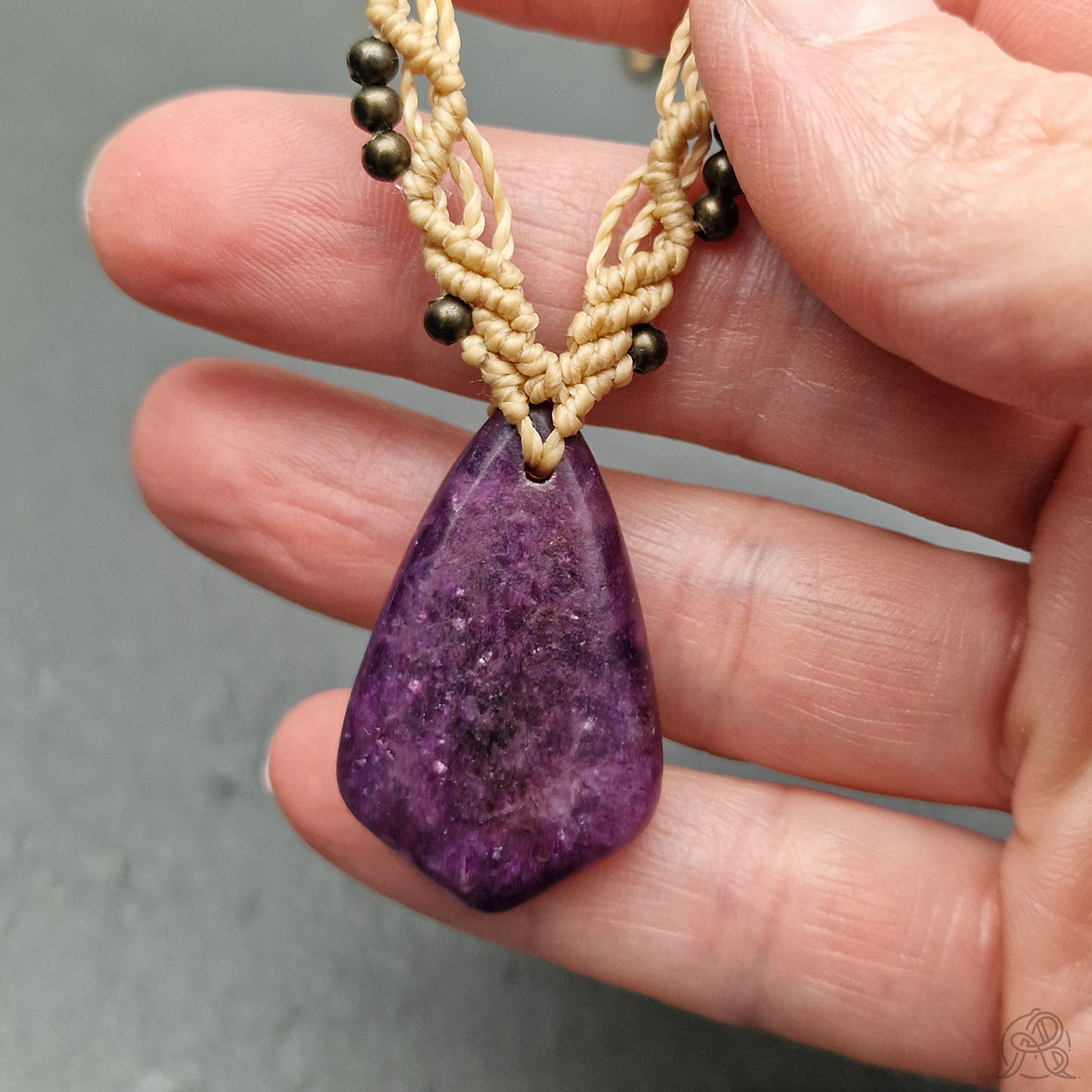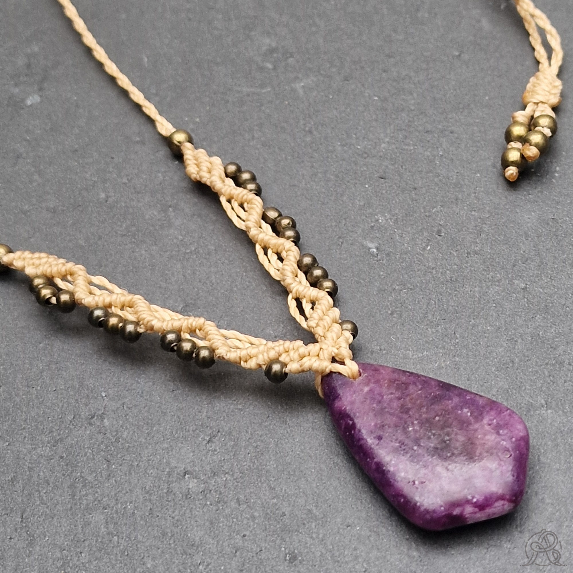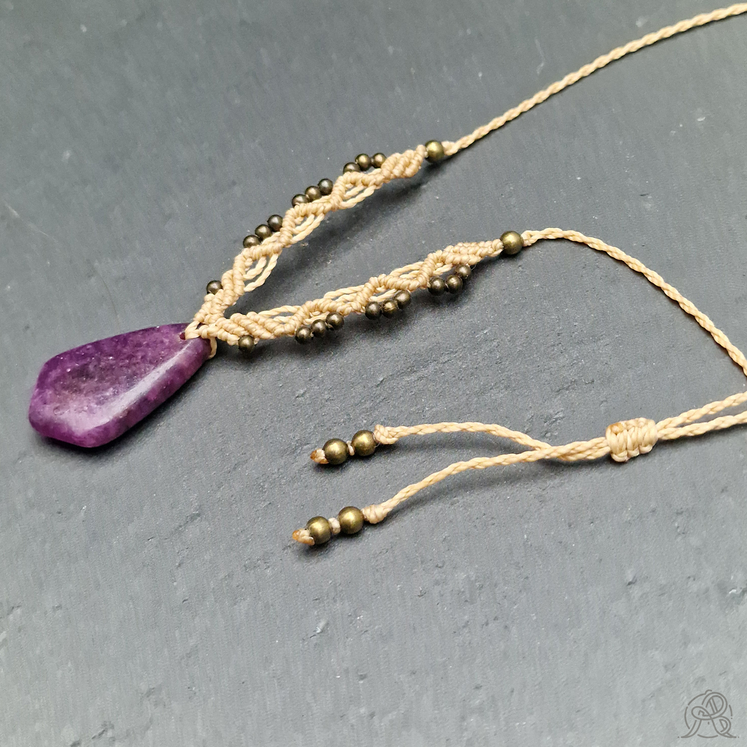 Pierre de Lepidolite montée en collier par la technique de micro-macramé avec un fil beige et des petites perles en laiton. Le cordon torsadé est de longueur réglable grâce à un nœud coulissant.