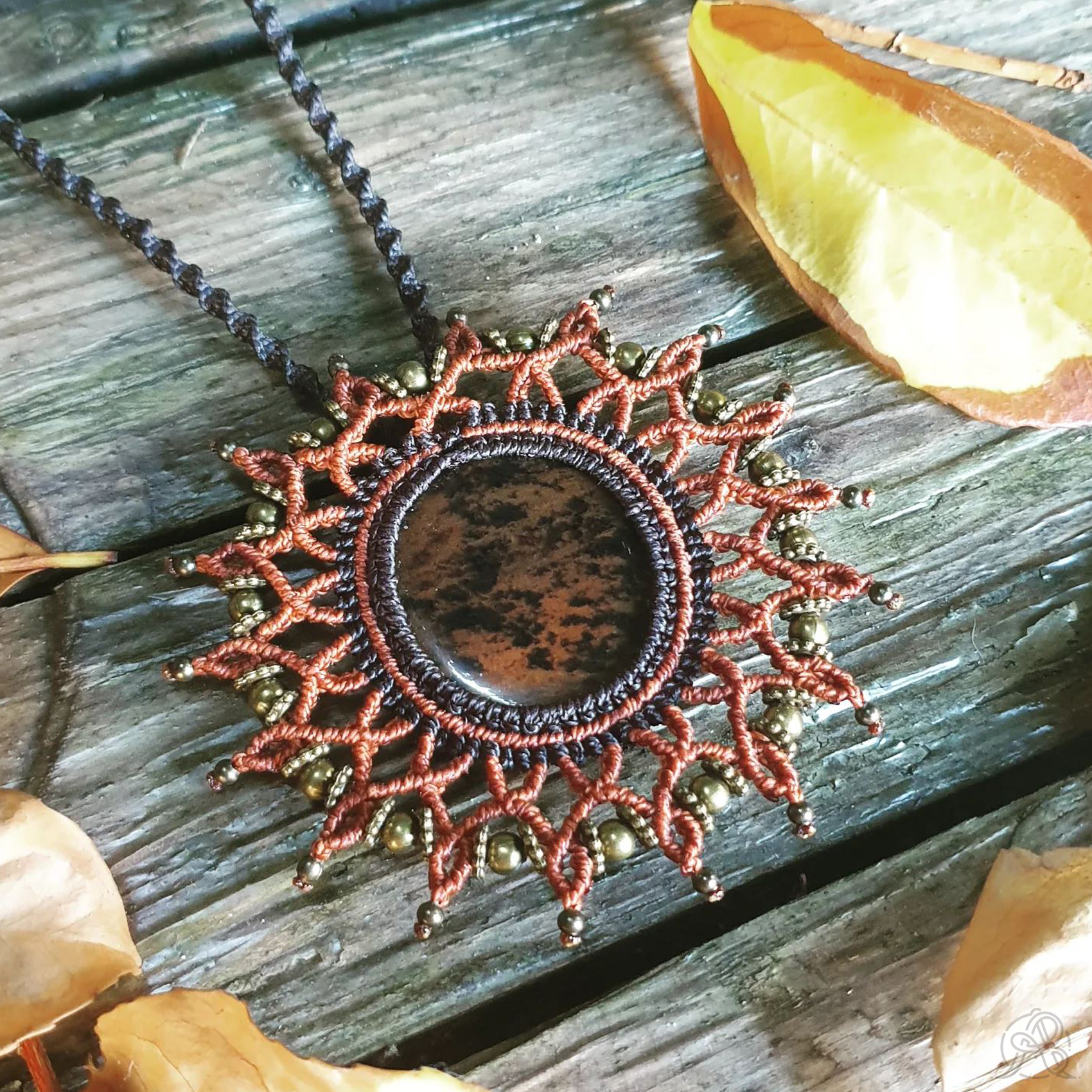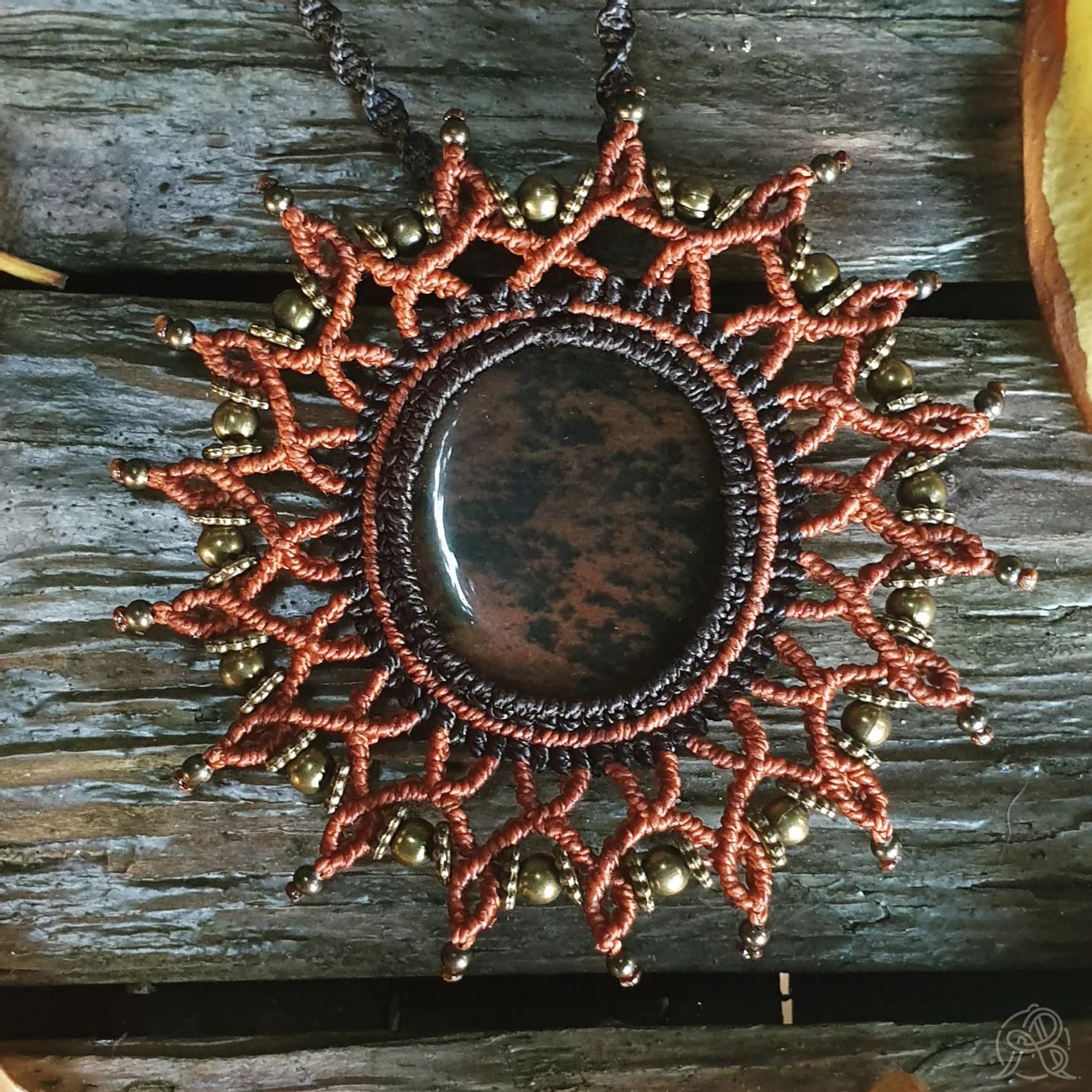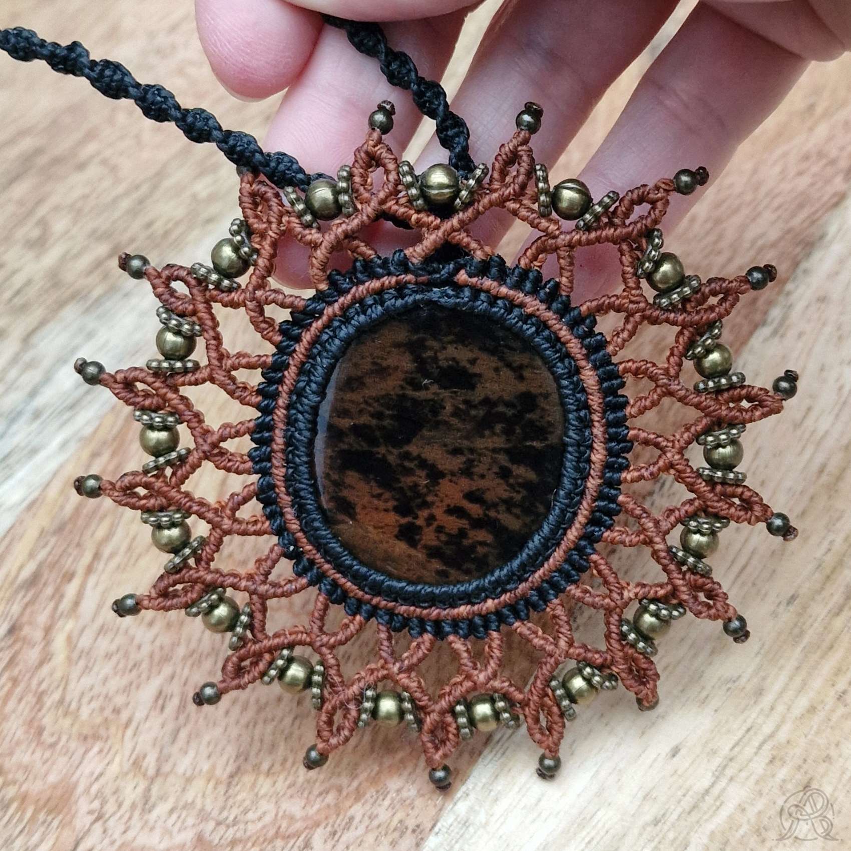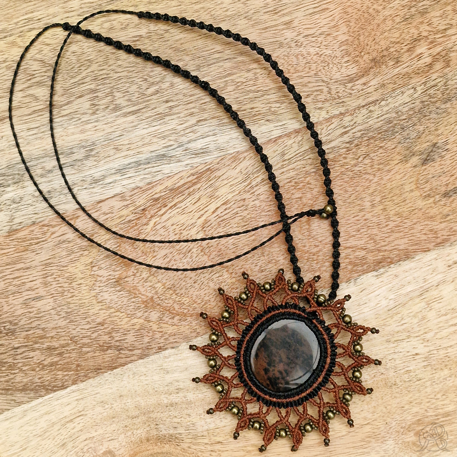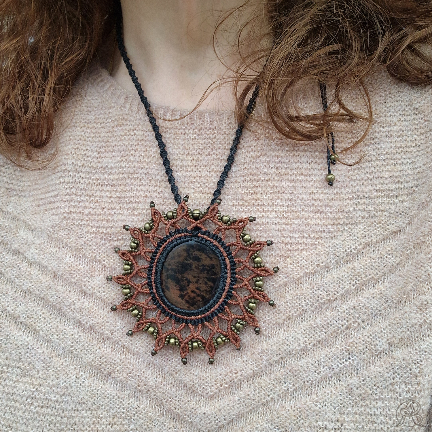 Pierre d’obsidienne acajou sertie par la technique de micro-macramé selon un motif mandala avec des fils de couleur camel et noir. Perles en laiton. Le pendentif est placé sur un cordon torsadé inamovible de longueur réglable grâce à un nœud coulissant.