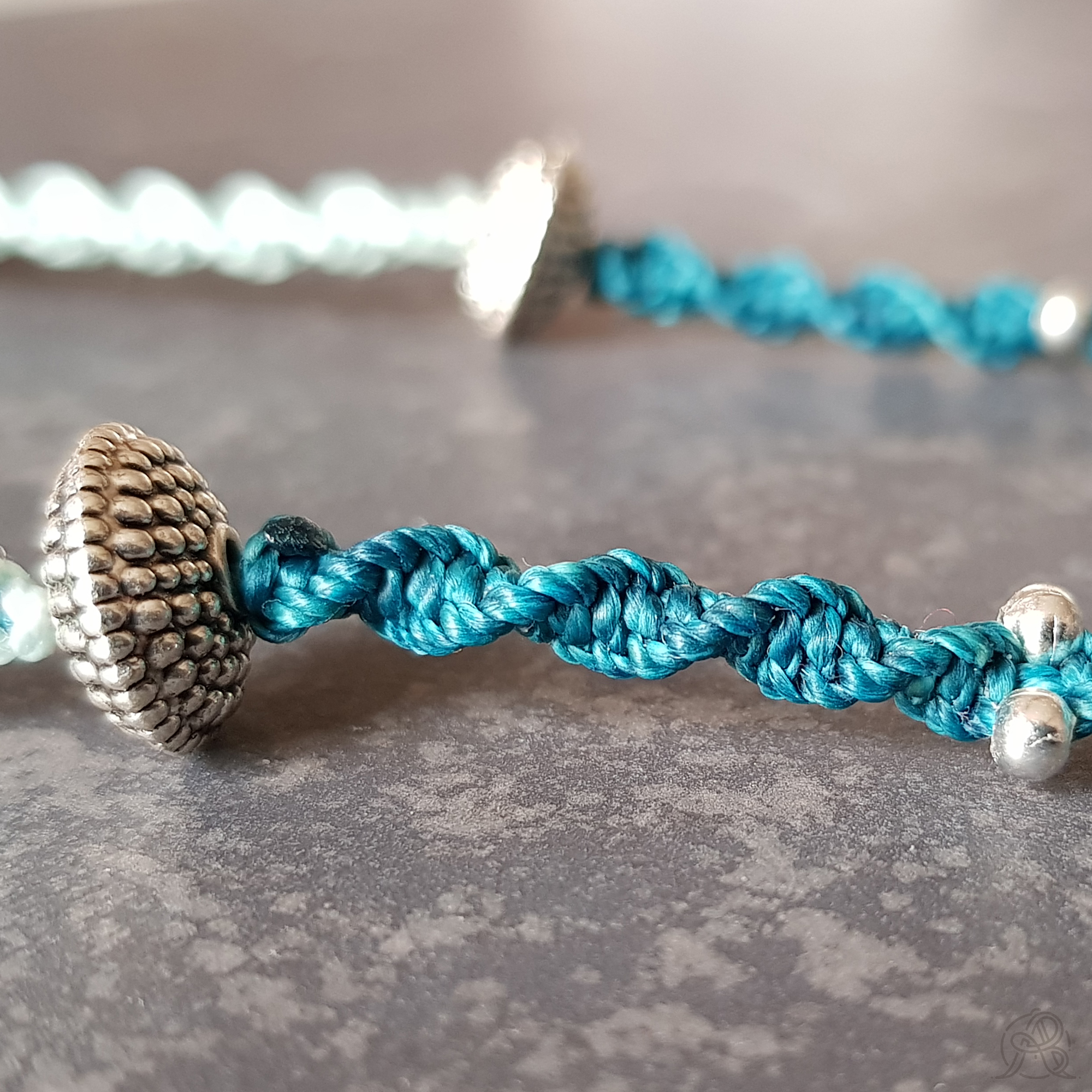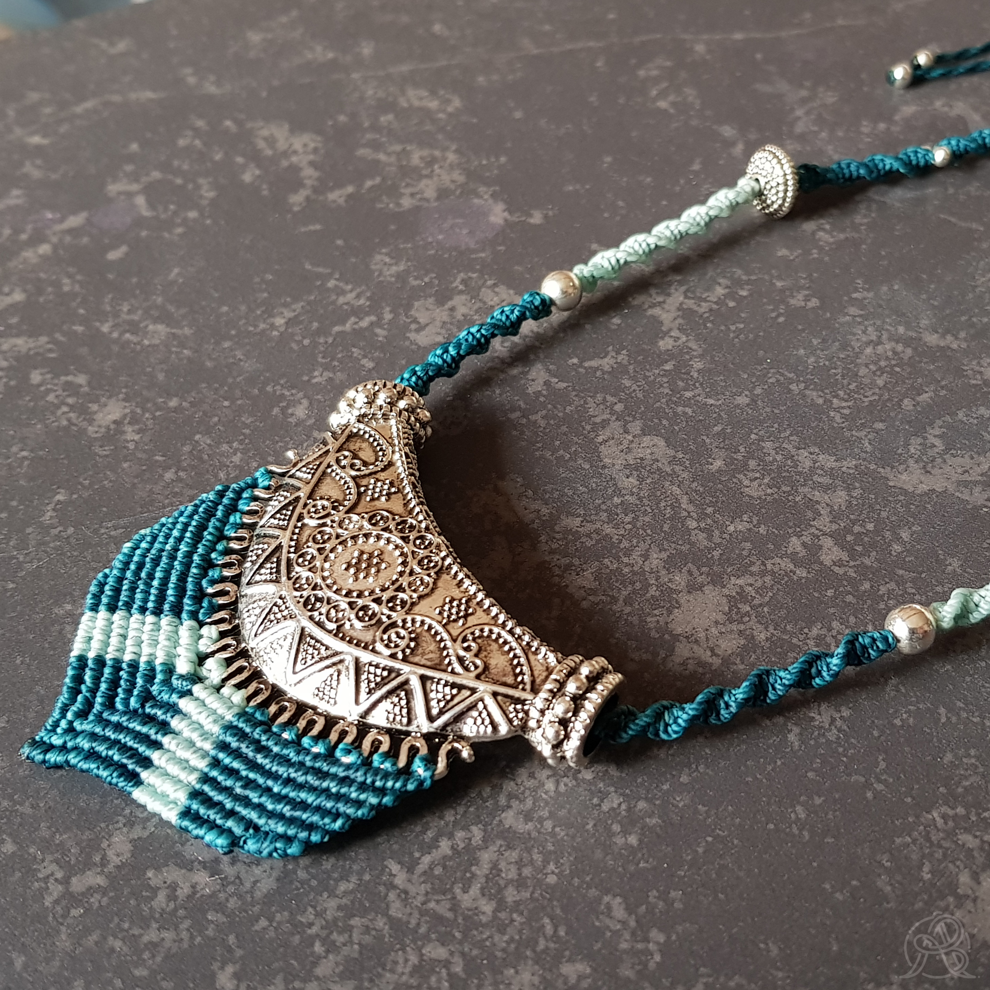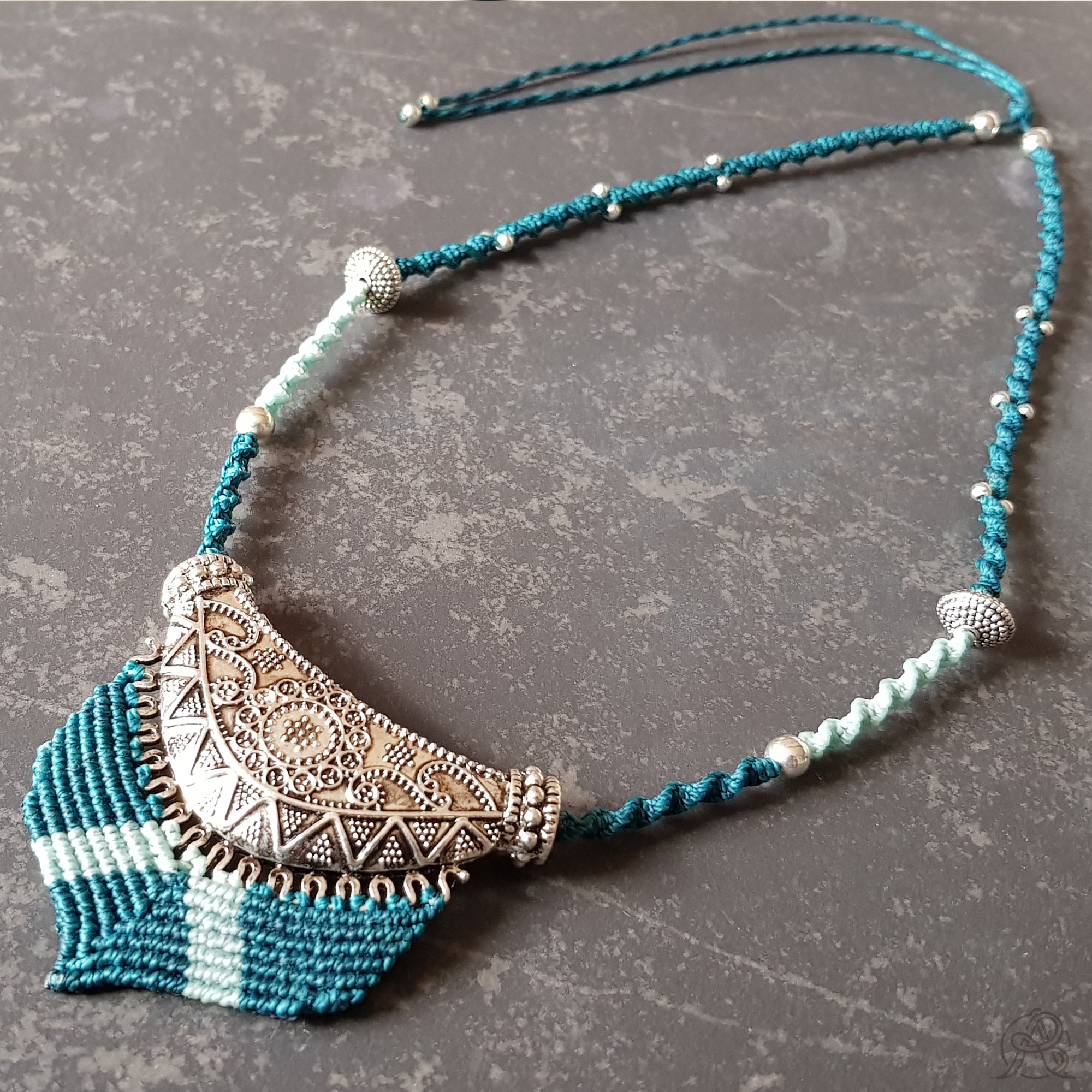Le cordon est une torsade en micro-macramé ponctué de perles argentées de différentes tailles. La longueur du collier est réglable grâce à un nœud coulissant.