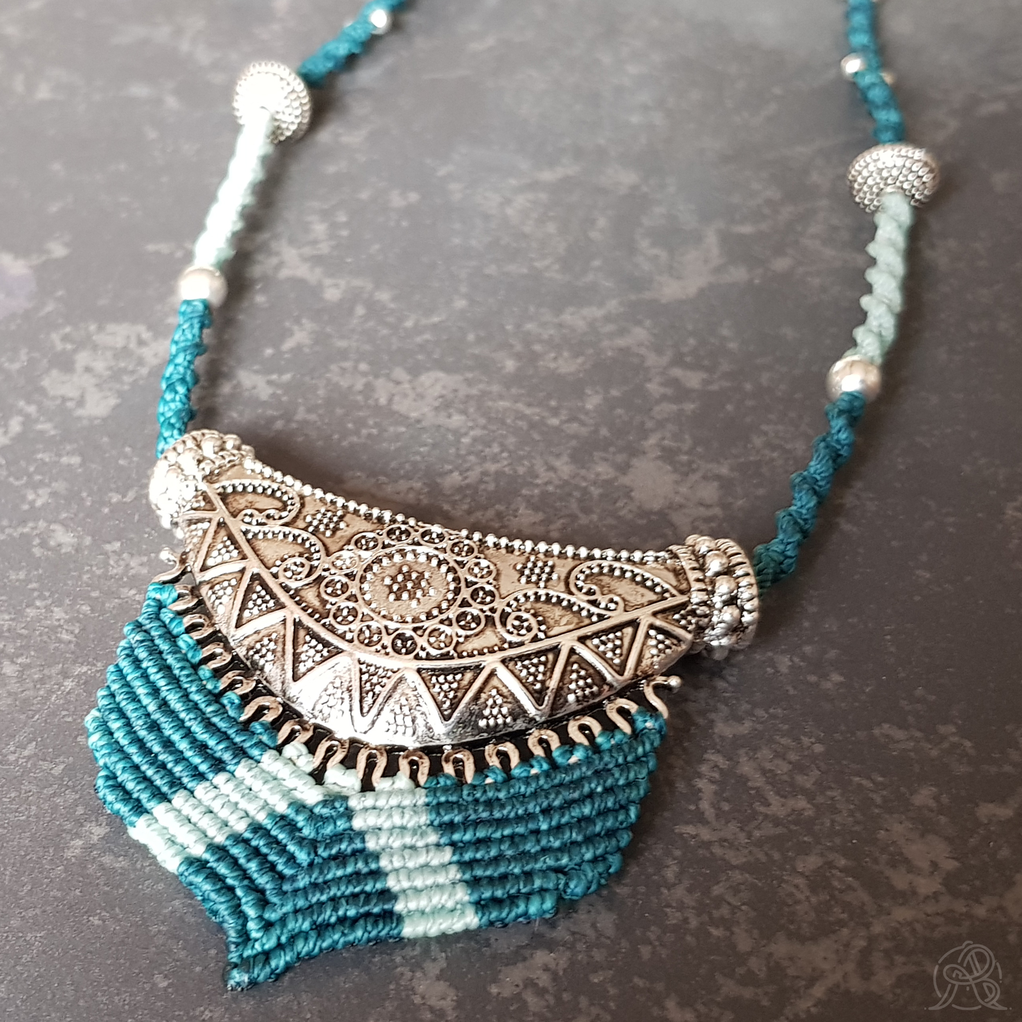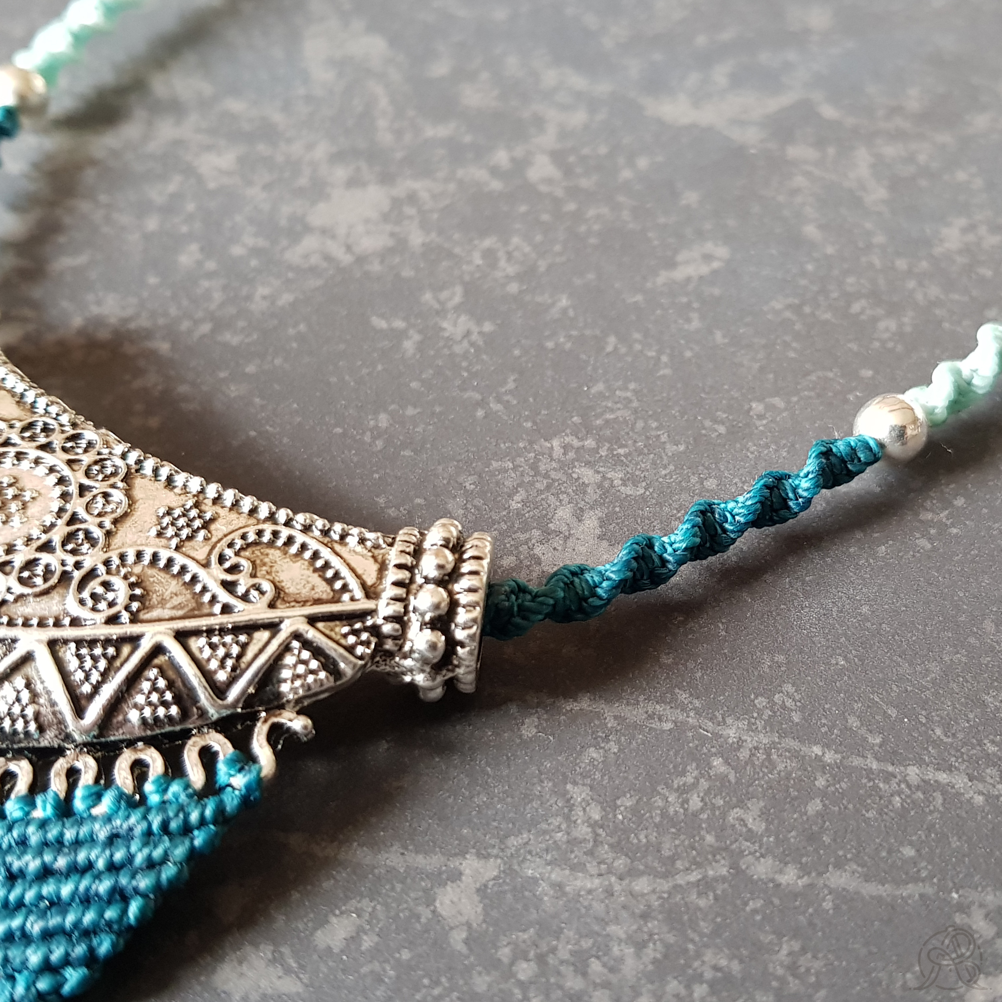 Le plastron central ciselé de style ethnique est en laiton argenté et surmonte un travail de micro-macramé symétrique de couleur bleu.