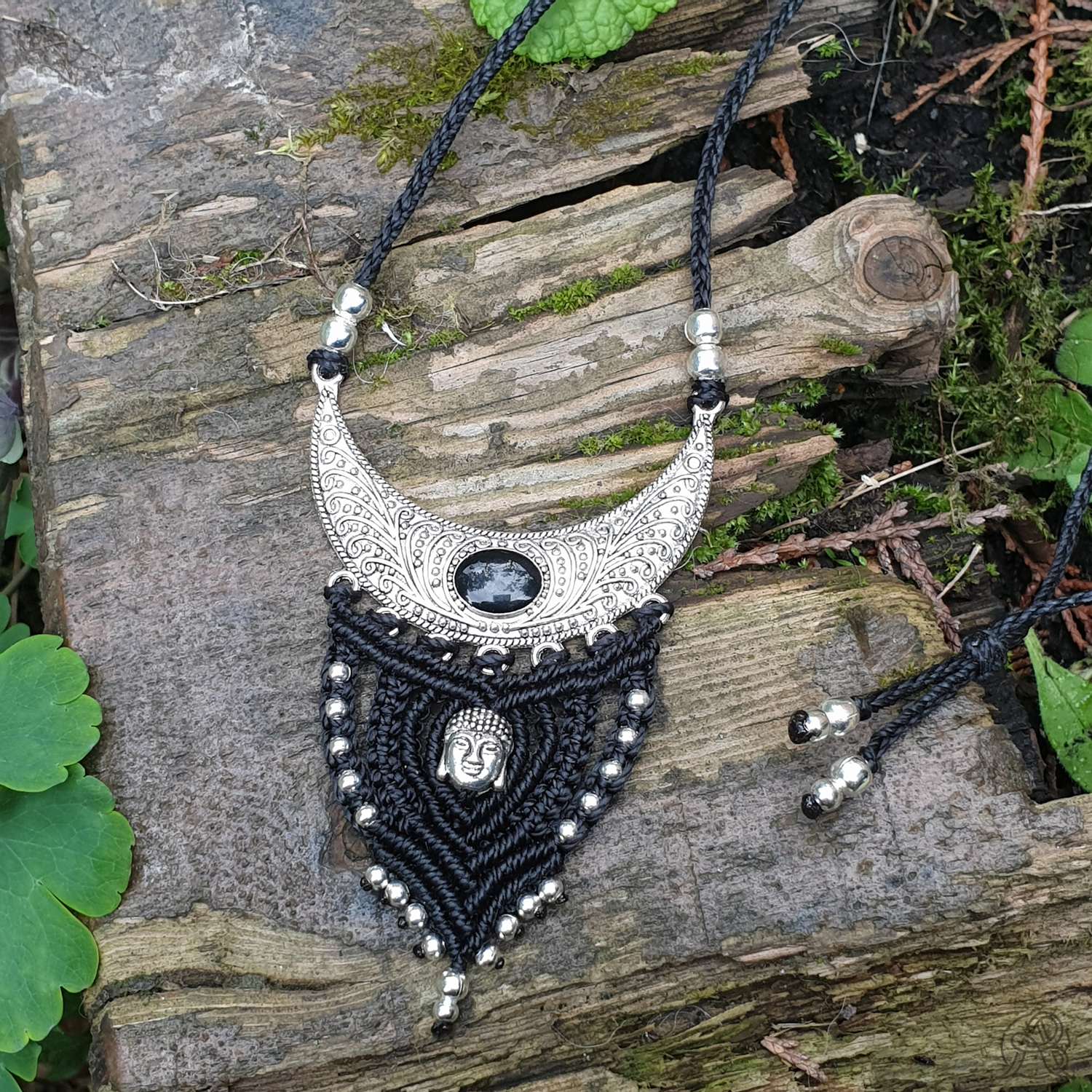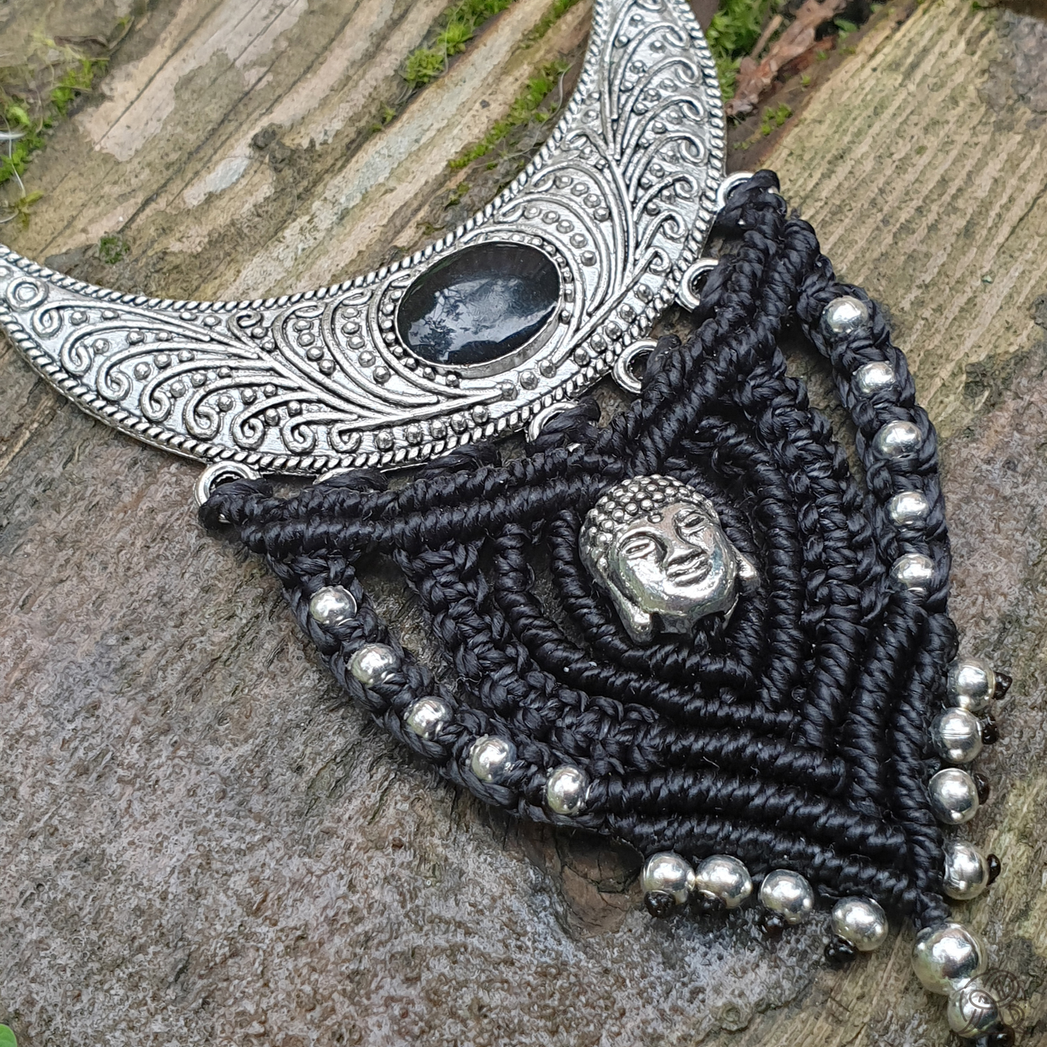 Le plastron central de style ethnique et cabochon noir est en laiton argenté et surmonte un travail de micro-macramé symétrique de couleur noir avec une perle tête de Bouddha et des perles rondes en laiton argenté.