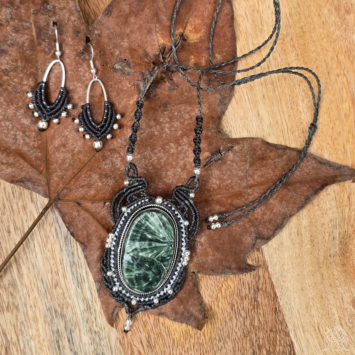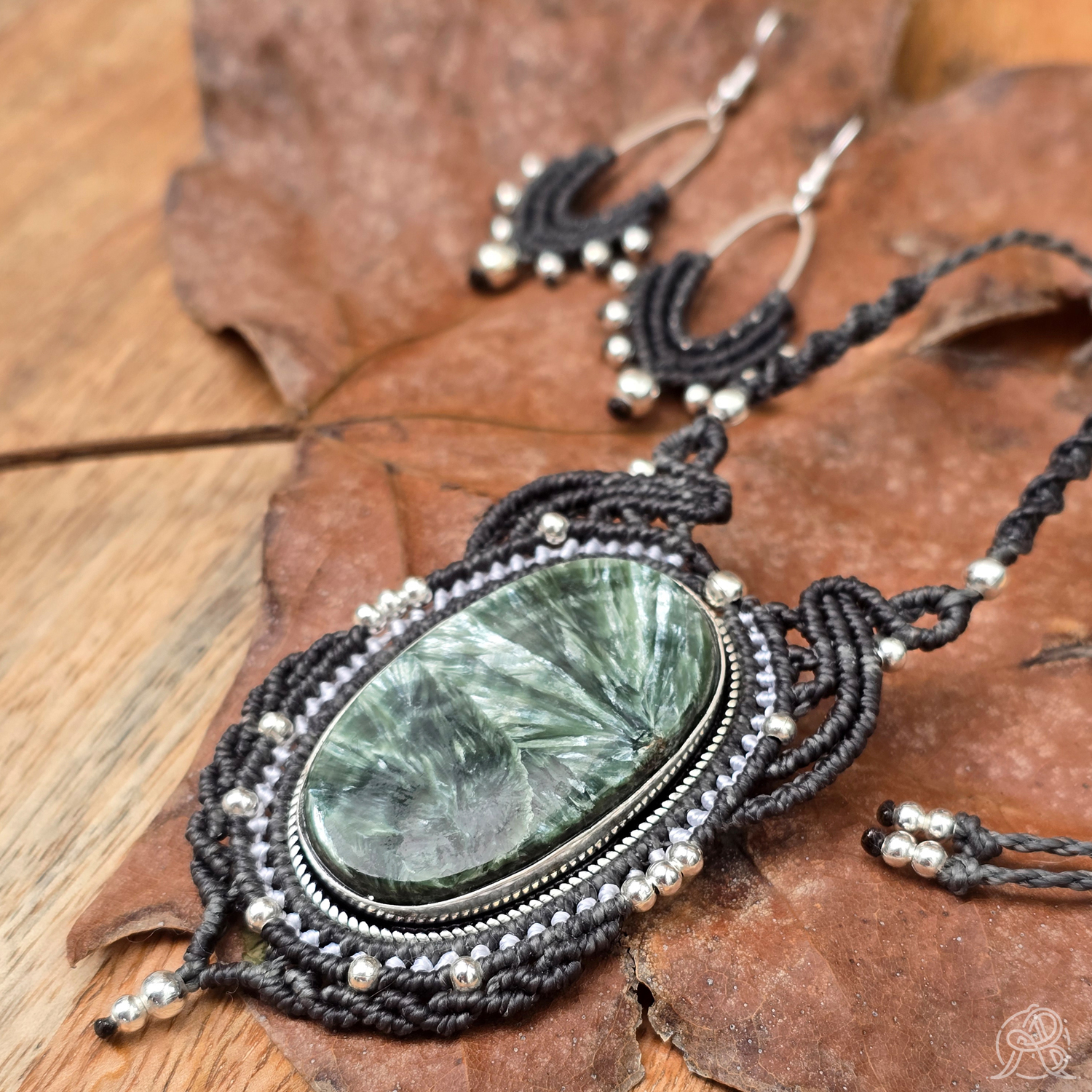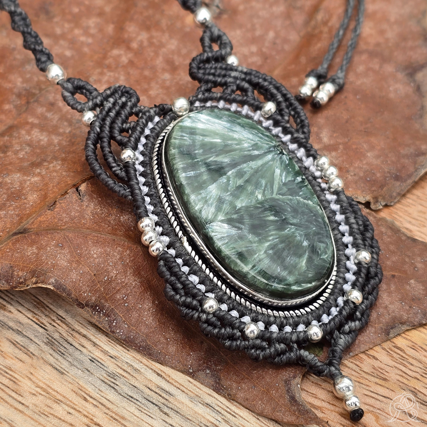 Pierre de Séraphinite sertie par la technique de micro-macramé avec des fils coloris vert fougère. Des perles de laiton argentées accompagnent la pierre naturelle. Le collier est doté d’un cordon au nouage fantaisie torsadé de longueur réglable grâce à un nœud coulissant.