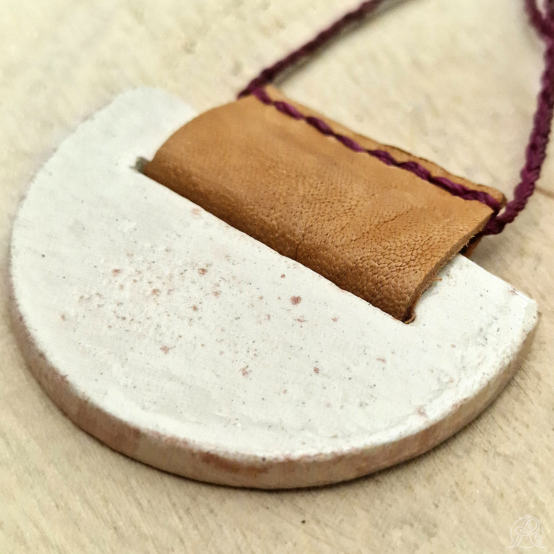 Demi-cercle en céramique monté en pendentif avec une pièce de cuir coloris camel.