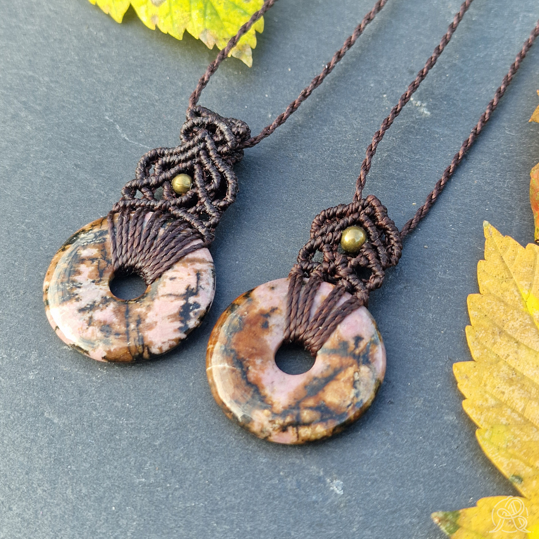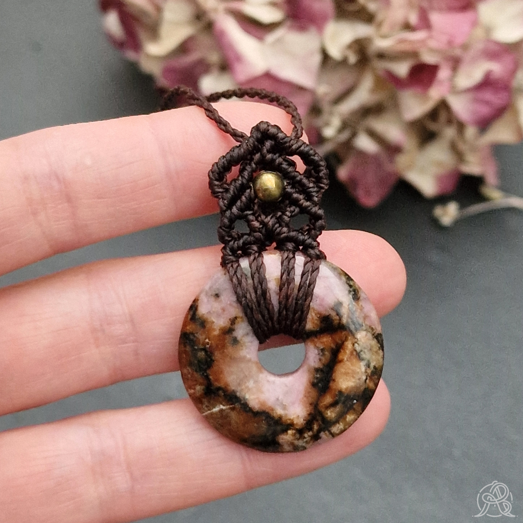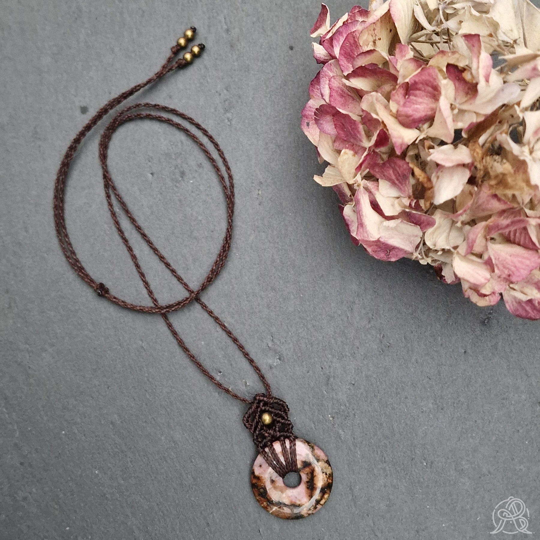 Donut en pierre de rhodonite monté en pendentif par la technique de micro-macramé avec un fil brun. Le pendentif de pierre naturelle est accompagné d’une perle en laiton et glissé sur un cordon de longueur réglable grâce à un nœud coulissant.