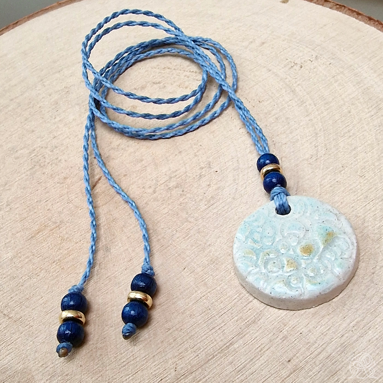 Médaillon en céramique monté en pendentif sur un cordon retordu bleu clair avec des perles en bois bleu roi et des élément métalliques en laiton.