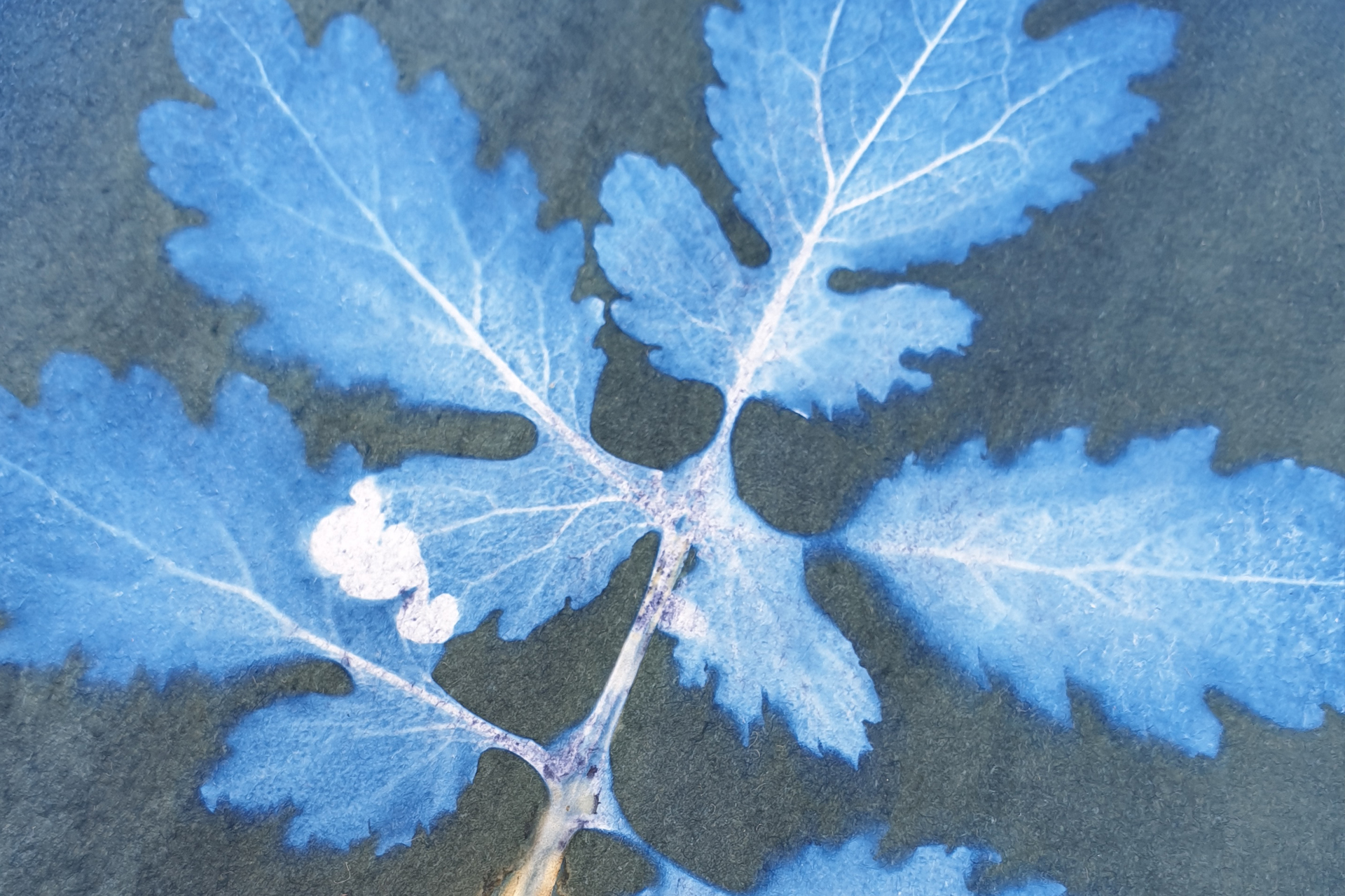 Le cyanotype célèbre la beauté de la nature. Utilisant les végétaux les plus gracieux, le soleil capture leurs empreintes délicates, modulant les contrastes selon leur épaisseur, leur couleur, et la lumière qui les traverse.
